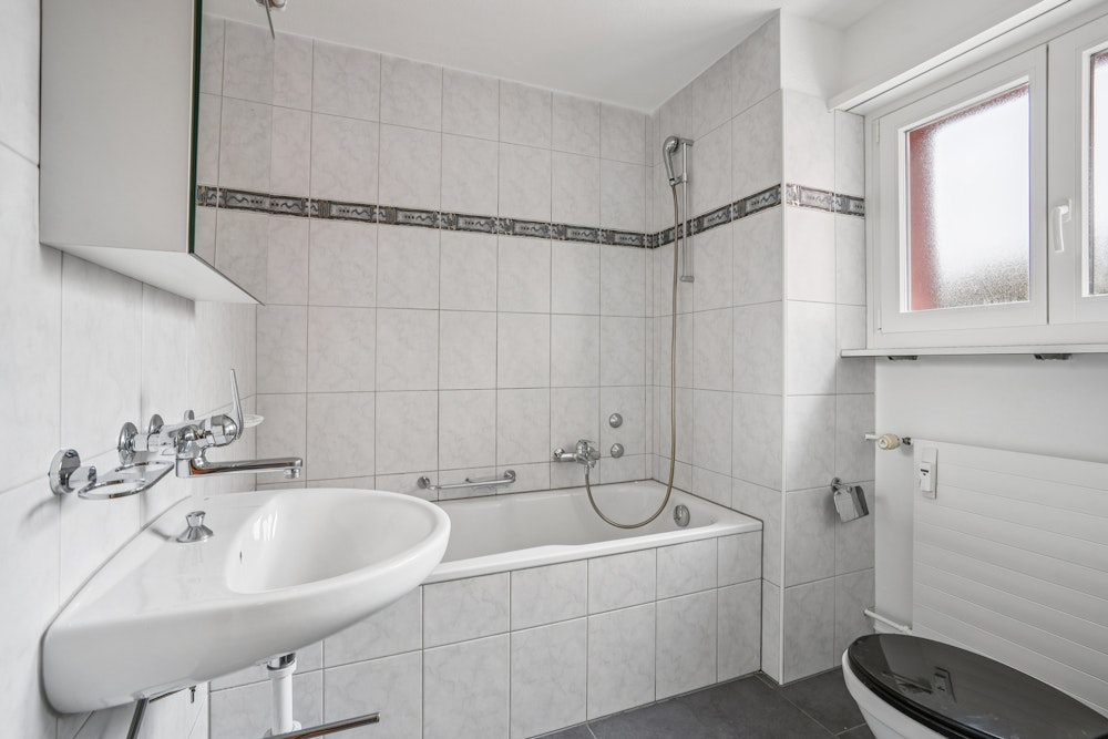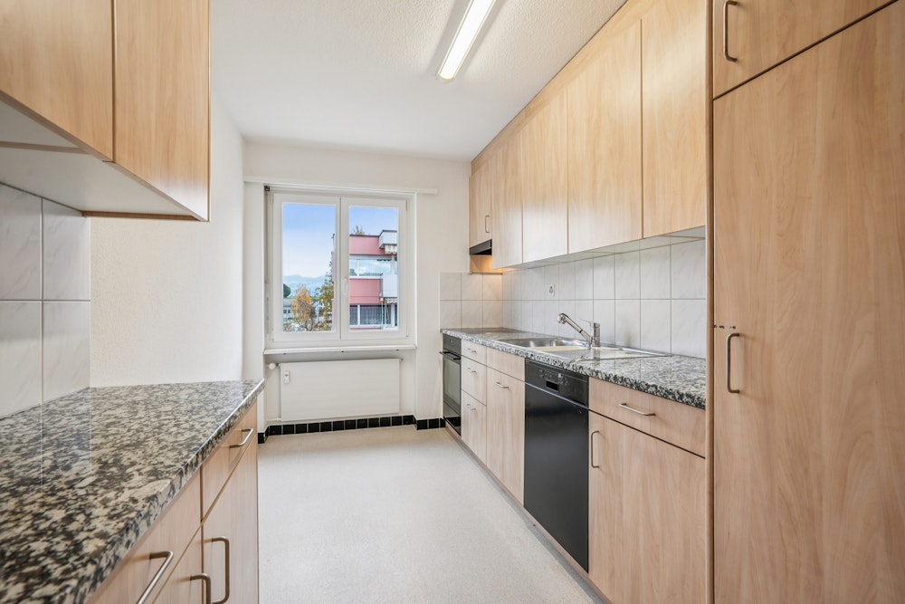 Die separate, geschlossene Küche bietet viel Stauraum und Arbeitsfläche. Küche, Bodenbeläge und sanitäre Einrichtungen entsprechen nicht mehr dem heutigen Standard und bieten Potenzial für individuelle Modernisierung.