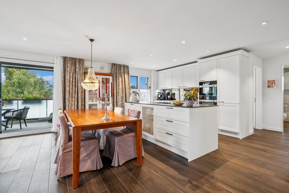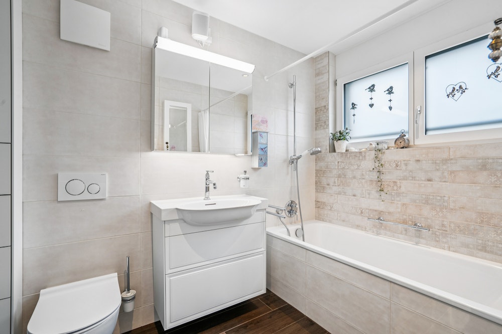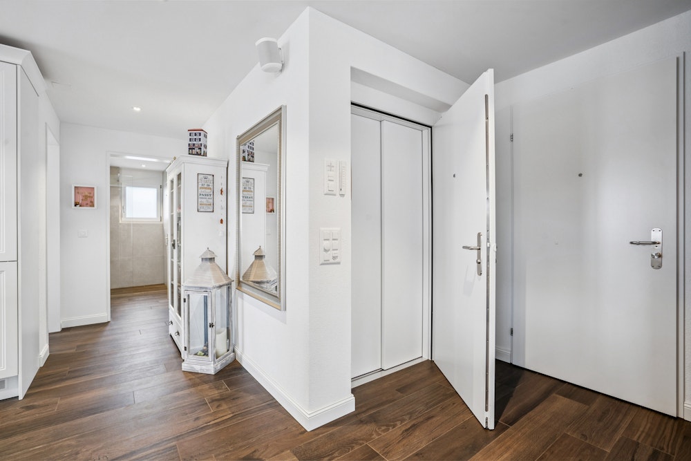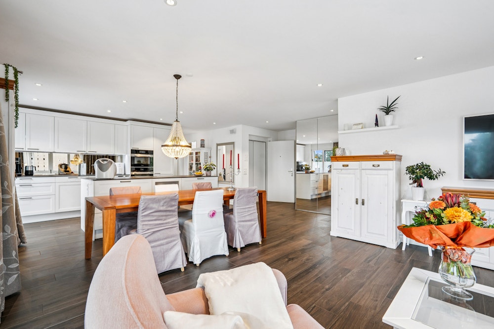 Der durchdachte Grundriss und die grossen Fenster schaffen ein helles, offenes Ambiente. Die Wohnung erstreckt sich über die gesamte Etage und bietet maximale Privatsphäre. Hochwertige Materialien, ein edler Plattenboden in Holzoptik und liebevolle Details verleihen jedem Raum Stil und Wärme.