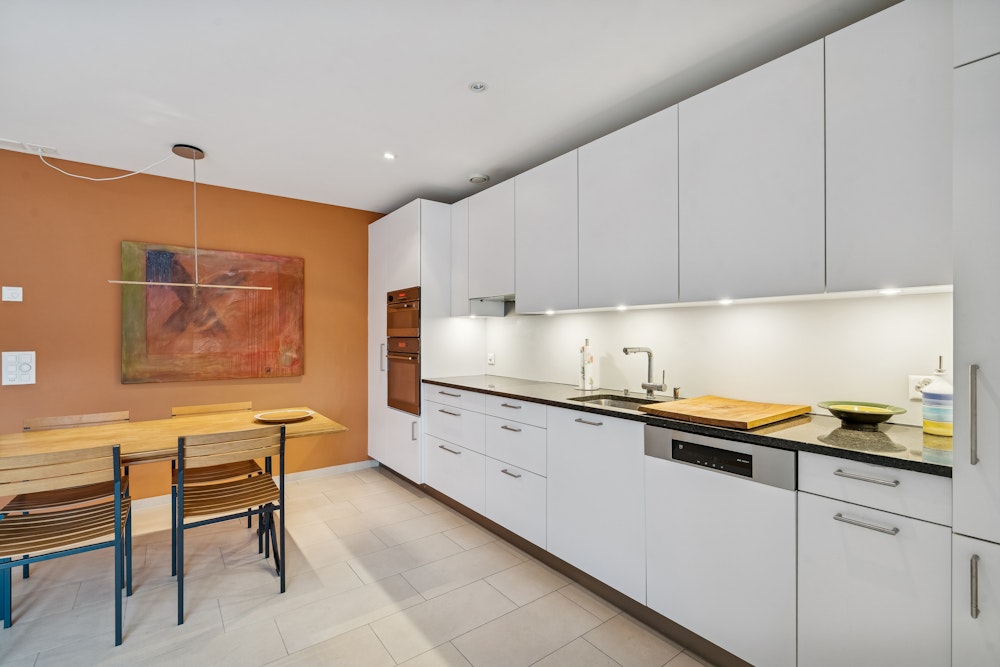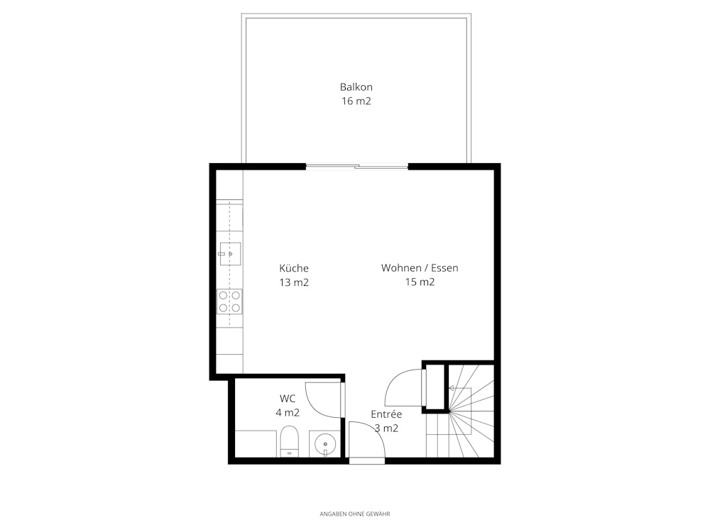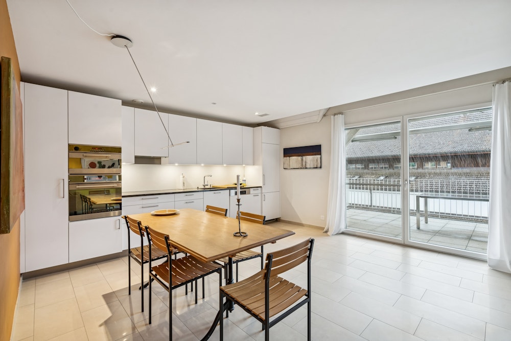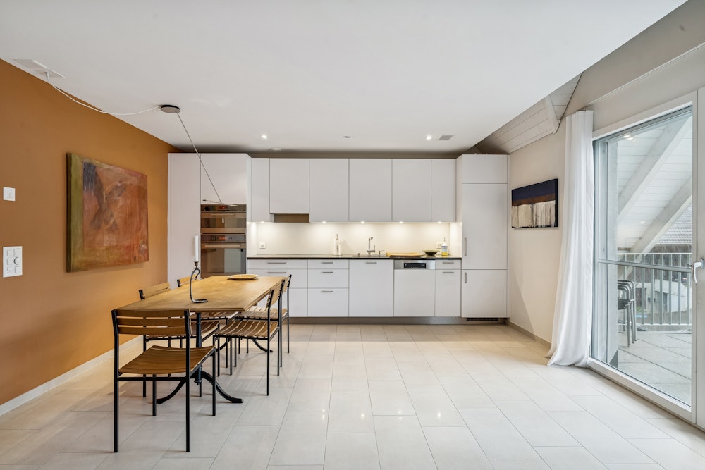 Der helle Wohn- und Essbereich mit offener Küche bildet das Herzstück der Wohnung und bietet direkten Zugang zum rund 16 m² grossen Balkon. Die westliche Ausrichtung lädt besonders in den Abendstunden zum Verweilen im Freien ein.
