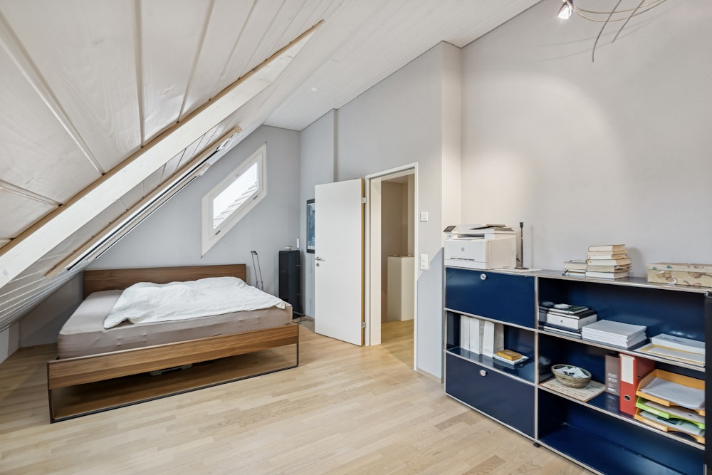 Im oberen Geschoss befindet sich das grosszügige Schlafzimmer mit Parkettboden sowie ein Badezimmer mit Badewanne und integrierter Waschnische mit eigener Waschmaschine und Tumbler.
